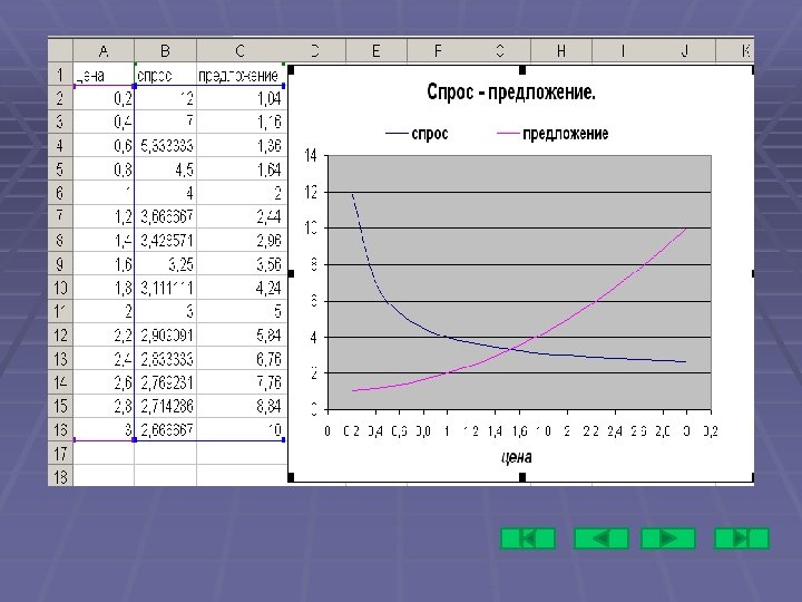 Графическое решение систем уравнений Системы двух уравнений с двумя неизвестными могут быть приближенно решены графически. Их решение – координаты точки пересечения кривых, соответствующих уравнениям системы. Рассмотрим пример графического решения системы двух уравнений. Зависимость спроса (у) на некоторый товар от его цены (х) выражается уравнением: а зависимость предложения от цены товара — уравнением z = x 2 + 1. Найти точку равновесия в диапазоне [0, 2; 3], если x изменяется с шагом h = 0, 2.