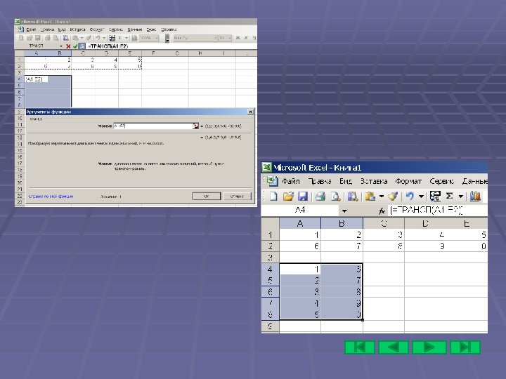 Операции с матрицами Функция ТРАНСП позволяет поменять ориентацию массива на рабочем листе с вертикальной на горизонтальную и наоборот. Функция имеет вид: ТРАНСП(массив). Рассмотрим ее действие на примере получения транспонированной матрицы для исходной матрицы А. Предположим, что в диапазон ячеек А 1: Е 2 введена исходная матрица размера 2 x 5
