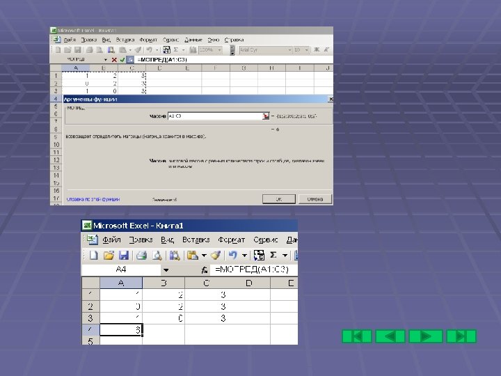 Вычисление определителя матрицы Функция имеет вид: МОПРЕД(массив). Здесь массив — это числовой массив, в котором хранится матрица с равным количеством строк и столбцов. Предположим, что в диапазон ячеек А 1: СЗ введена матрица: Необходимо вычислить определитель этой матрицы.