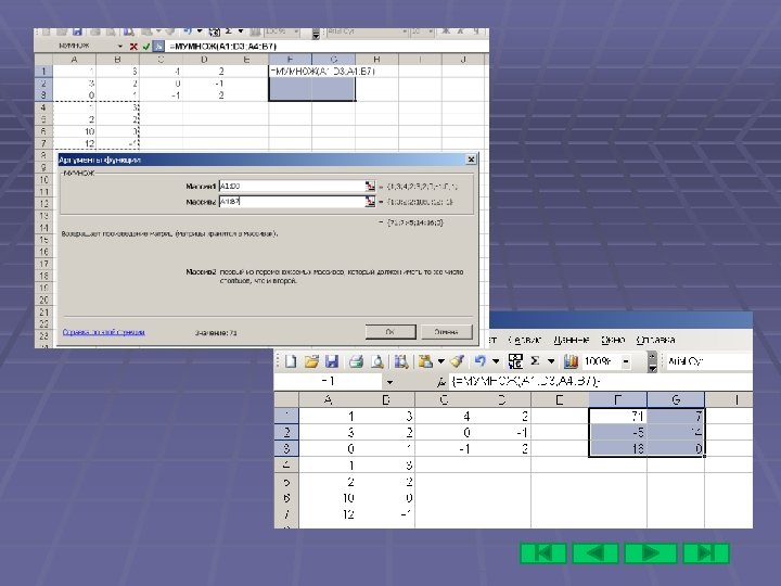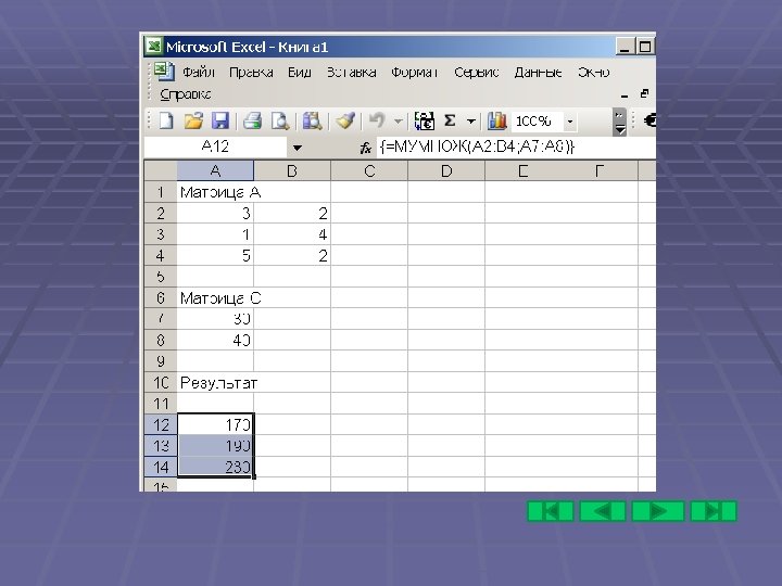 Умножение матриц Функция имеет вид МУМНОЖ (массив 1; массив 2). Здесь массив 1 и массив 2— это перемножаемые матрицы. Пусть матрица А введена в диапазон A 1: D 3, а матрица В — в диапазон А 4: В 7. Необходимо найти С – произведение этих матриц. Порядок действий: 1) Выделите блок ячеек под результирующую матрицу. Например, F 1: G 3. 2) В диалоговом окне Мастер функций в поле Категория выберите Математические, а в поле Функция — имя функции МУМНОЖ. После этого щелкните на кнопке ОК. 3) Введите диапазоны исходных матриц А — A 1: D 3 в поле Массив 1 и матрицы В —в поле Массив 2. После этого нажмите сочетание клавиш CTRL+SHIFT+ENTER. В диапазоне F 1: G 3 получили элементы С.