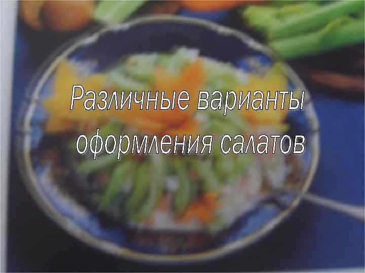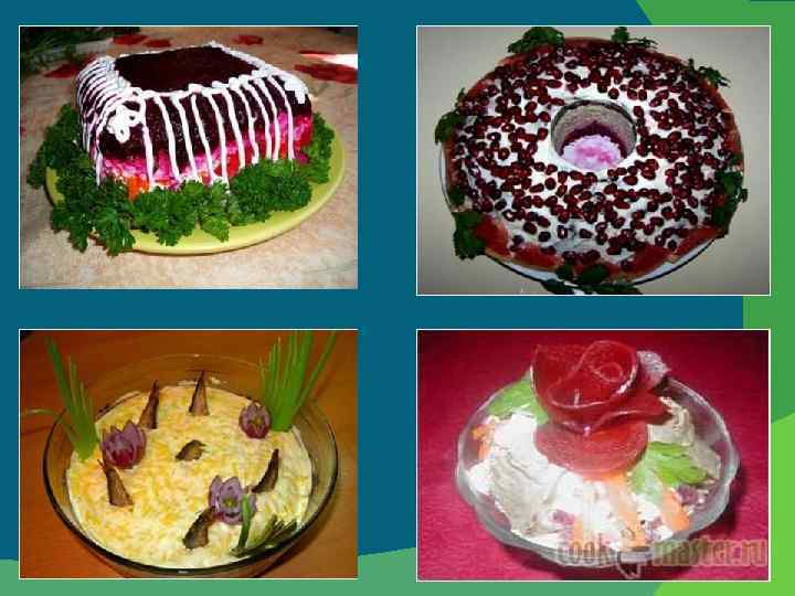 Разновидности салатов. Из сырых овощей. Из варёных овощей. Винегреты. Из смеси овощей и фруктов. С добавлением мясных, рыбных, гастрономических и других продуктов.