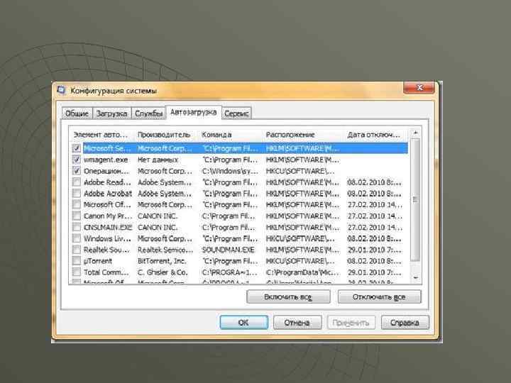 Автозагрузка. Вкладка «Автозагрузка» отвечает за загрузку приложений, а так же определённых служебных утилит, загружаемых не через службы. Как видно на предыдущем скриншоте данная вкладка разбита на пять колонок. Эти колонки были созданы для того, чтобы вы могли знать название автоматически загружаемого приложения, издателя данной программы, путь, указывающий, откуда загружается та или иная программа, расположение раздела реестра или ярлыка программы, а также дату, когда программа была отключена из автозагрузки. Для того чтобы определенный элемент автозагрузки не запускался во время следующей загрузки, снимите соответствующий флажок