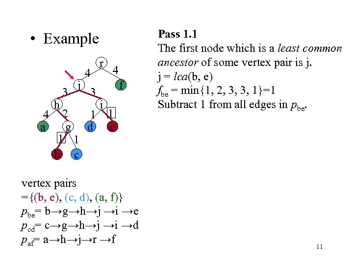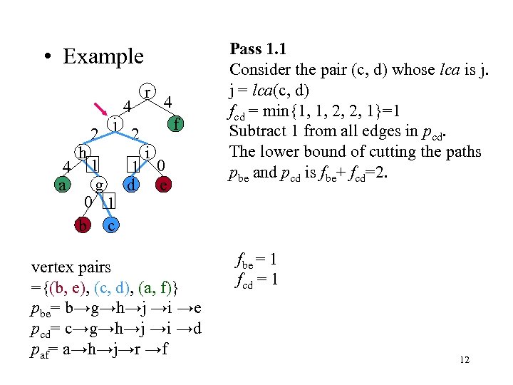 • Example 4 a h 3 j 4 3 r 4 f i 2 1 1 g d e 1 1 b c vertex pairs ={(b, e), (c, d), (a, f)} pbe= b→g→h→j →i →e pcd= c→g→h→j →i →d paf= a→h→j→r →f Pass 1. 1 The first node which is a least common ancestor of some vertex pair is j. j = lca(b, e) fbe = min{1, 2, 3, 3, 1}=1 Subtract 1 from all edges in pbe. 11