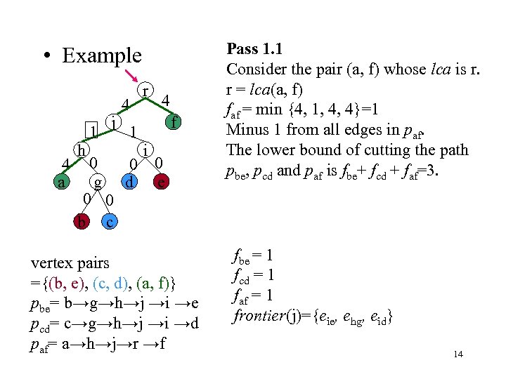 • Example 4 a h 1 j 4 1 r 4 f i 0 0 0 g d e 0 0 b c vertex pairs ={(b, e), (c, d), (a, f)} pbe= b→g→h→j →i →e pcd= c→g→h→j →i →d paf= a→h→j→r →f Pass 1. 2 Let Q be the set of edges such that ci=0. Q = {egb, eie , ehg , egc , eid}. Pairs (b, e) and (c, d) have the same least common ancestor, j, and ehg is the ancestor of egb and egc in Q. egb and egc are not added to frontier(j) = Q - {egb, egc} = {eie, ehg, eid}. fbe = 1 fcd = 1 13