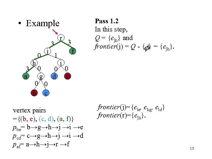 • Example 4 a h 1 j 4 1 r 4 f i 0 0 0 g d e 0 0 b c vertex pairs ={(b, e), (c, d), (a, f)} pbe= b→g→h→j →i →e pcd= c→g→h→j →i →d paf= a→h→j→r →f Pass 1. 1 Consider the pair (a, f) whose lca is r. r = lca(a, f) faf = min {4, 1, 4, 4}=1 Minus 1 from all edges in paf. The lower bound of cutting the path pbe, pcd and paf is fbe+ fcd + faf=3. fbe = 1 fcd = 1 faf = 1 frontier(j)={eie, ehg, eid} 14