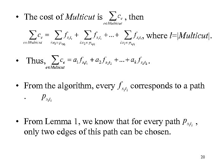 Lemma Let si-ti be a path and let v be the least common ancestor of si, ti. Then Multucut contains at most one edge from the path si-v and one edge from the path tiv. v si ti • Whenever an edge e is chosen, its cost must be a summation of ’s. That is, for every ce in Multicut. 19