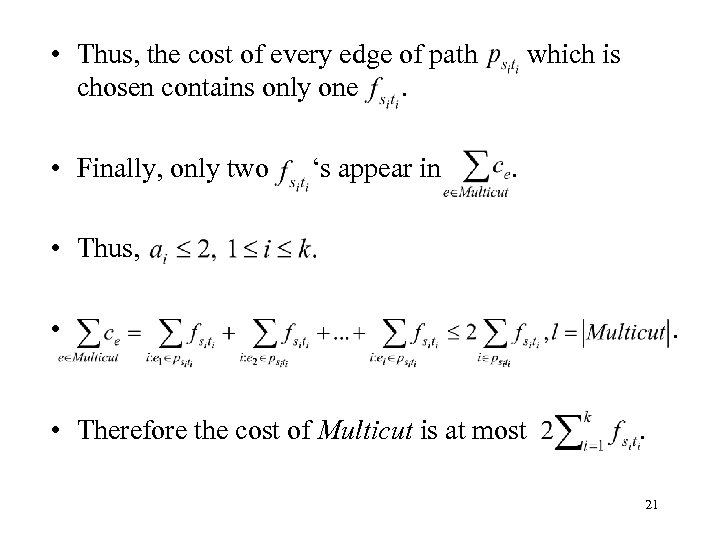 • The cost of Multicut is , then , where l=|Multicut|. • Thus, • From the algorithm, every. . corresponds to a path • From Lemma 1, we know that for every path only two edges of this path can be chosen. , 20