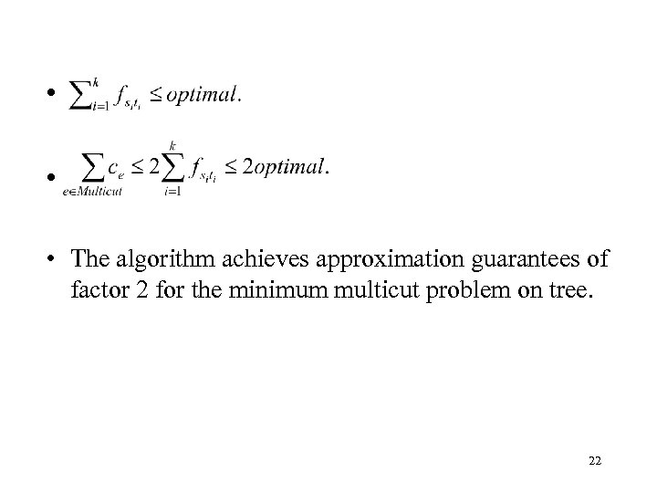 • • • The algorithm achieves approximation guarantees of factor 2 for the minimum multicut problem on tree. 22