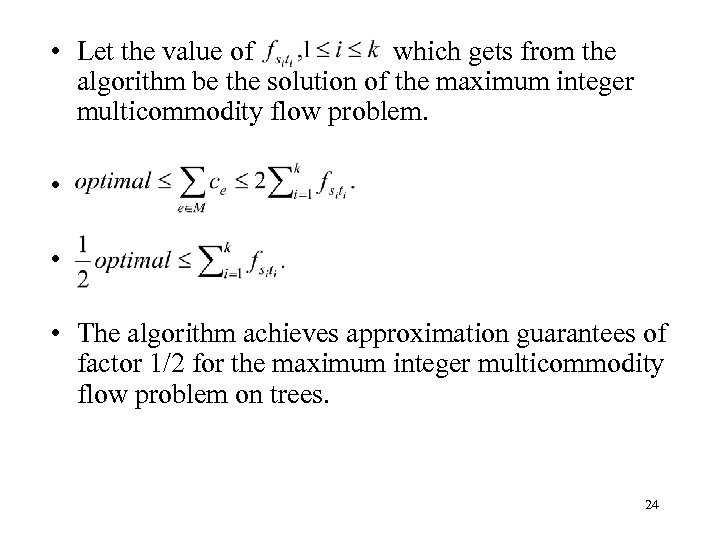 • Let the value of which gets from the algorithm be the solution of the maximum integer multicommodity flow problem. • • • The algorithm achieves approximation guarantees of factor 1/2 for the maximum integer multicommodity flow problem on trees. 24