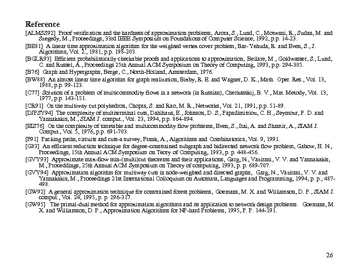 Reference [ALMSS 92] Proof verification and the hardness of approximation problems, Arora, S. , Lund, C. , Motwani, R. , Sudan, M. and Szegedy, M. , Proceedings, 33 rd IEEE Symposium on Foundations of Computer Science, 1992, p. p. 14 -23. [BE 81] A linear time approximation algorithm for the weighted vertex cover problem, Bar- Yehuda, R. and Even, S. , J. Algorithms, Vol. 2. , 1981, p. p. 198 -203. [BGLR 93] Efficient probabilistically checkable proofs and applications to approximation, Bellare, M. , Goldwasser, S. , Lund, C. and Russel, A. , Proceedings 25 th Annual ACM Symposium on Theory of Computing, 1993, p. p. 294 -305. [B 76] Graph and Hypergraphs, Berge, C. , North-Holland, Amsterdam, 1976. [BW 88] An almost linear time algorithm for graph realization, Bixby, R. E. and Wagner, D. K. , Math. Oper. Res. , Vol. 13, 1988, p. p. 99 -123. [C 77] Solution of a problem of multicommodity flows in a network (in Russian), Cherkasskij, B. V. , Mat. Metody, Vol. 13, 1977, p. p. 143 -151. [CR 91] On the multiway cut polyhedron, Chopra, S. and Rao, M. R. , Networks, Vol. 21, 1991, p. p. 51 -89. [DJPSY 94] The complexity of multiterminal cuts, Dahlhaus, E. , Johnson, D. S. , Papadimitriou, C. H. , Seymour, P. D. and Yannakakis, M. , SIAM J. comput. , Vol. 23, 1994, p. p. 864 -894. [EIS 76] On the complexity of timetable and multicommodity flow problems, Even, S. , Itai, A. and Shamir, A. , SIAM J. Comput. , Vol. 5, 1976, p. p. 691 -703. [F 91] Packing paths, circuits and cuts-a survey, Frank, A. , Algorithms and Combinatorics, Vol. 9, 1991. [G 83] An efficient reduction technique for degree-constrained subgraph and bidirected network flow problem, Gabow, H. N. , Proceedings, 15 th Annual ACM Symposium on Teory of Computing, 1983, p. p. 448 -456. [GVY 93] Approximate max-flow min-(multi)cut theorems and their applications, Garg, N. , Vazirani, V. V. and Yannakakis, M. , Proceddings, 25 th Annual ACM Symposium on Theory of computing, 1993, p. p. 689 -707. [GVY 94] Approximation algorithm for multiway cuts in node-weighted and directed graphs, Garg, N. , Vazirani, V. V. and Yannakakis, M. , Proceedings 21 st International Colloquium on Automata, Languages and Programming, 1994, p. p. , 487498. [GW 92] A general approximation technique for constrained forest problems, Goemans, M. X. and Williamson, D. P. , SIAM J. comput. , Vol. 24, 1995, p. p. 296 -317. [GW 95] The primal-dual method for approximation algorithms and its application to network design problems. Goemans, M. X. and Williamson, D. P. , Approximation Algorithms for NP-hard Problems, 1995, P. P. 144 -191. 26