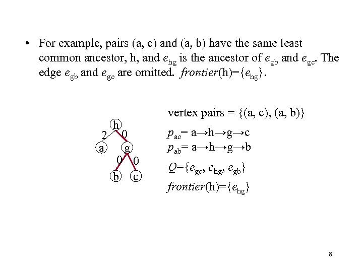 • For example, pairs (a, c) and (a, b) have the same least common ancestor, h, and ehg is the ancestor of egb and egc. The edge egb and egc are omitted. frontier(h)={ehg}. 2 a h 0 g 0 0 b c vertex pairs = {(a, c), (a, b)} pac= a→h→g→c pab= a→h→g→b Q={egc, ehg, egb} frontier(h)={ehg} 8
