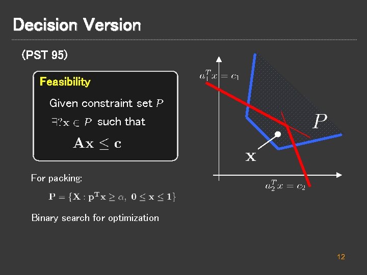 Decision Version (PST 95) Feasibility Given constraint set such that For packing: Binary search for optimization 12