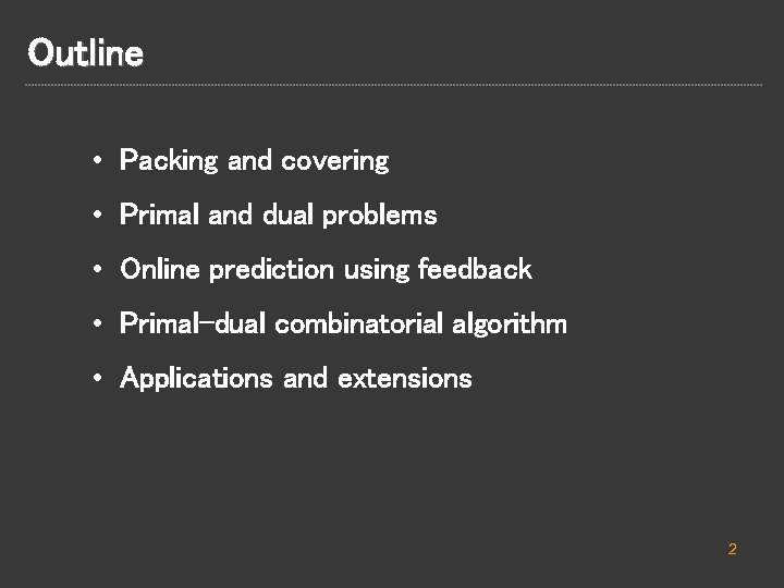 Outline • Packing and covering • Primal and dual problems • Online prediction using feedback • Primal-dual combinatorial algorithm • Applications and extensions 2