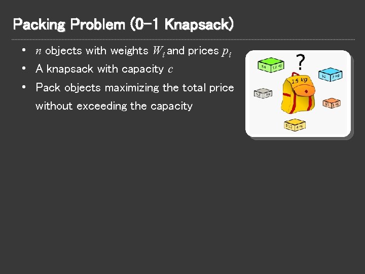 Packing Problem (0 -1 Knapsack) • n objects with weights Wi and prices pi • A knapsack with capacity c • Pack objects maximizing the total price without exceeding the capacity