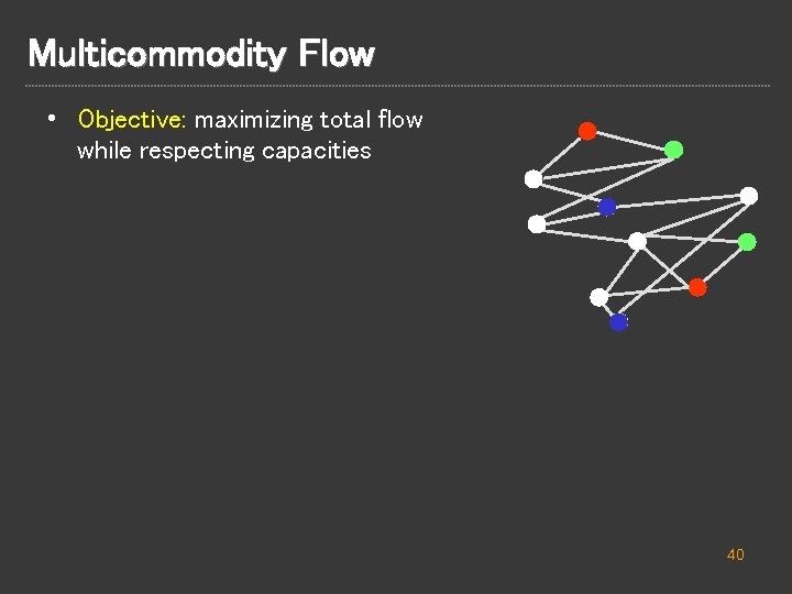 Multicommodity Flow • Objective: maximizing total flow while respecting capacities 40
