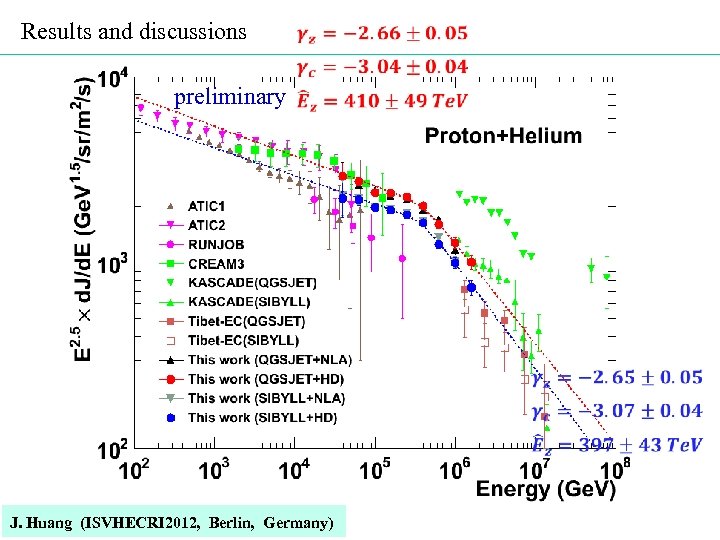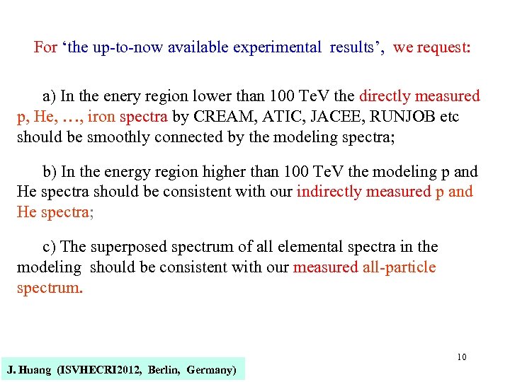 For ‘the up-to-now available experimental results’, we request: a) In the enery region lower than 100 Te. V the directly measured p, He, …, iron spectra by CREAM, ATIC, JACEE, RUNJOB etc should be smoothly connected by the modeling spectra; b) In the energy region higher than 100 Te. V the modeling p and He spectra should be consistent with our indirectly measured p and He spectra; c) The superposed spectrum of all elemental spectra in the modeling should be consistent with our measured all-particle spectrum. J. Huang (ISVHECRI 2012, Berlin, Germany) 10
