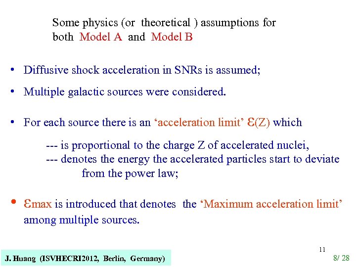 Some physics (or theoretical ) assumptions for both Model A and Model B • Diffusive shock acceleration in SNRs is assumed; • Multiple galactic sources were considered. • For each source there is an ‘acceleration limit’ ε(Z) which --- is proportional to the charge Z of accelerated nuclei, --- denotes the energy the accelerated particles start to deviate from the power law; • εmax is introduced that denotes the ‘Maximum acceleration limit’ among multiple sources. J. Huang (ISVHECRI 2012, Berlin, Germany) 11 8/ 28