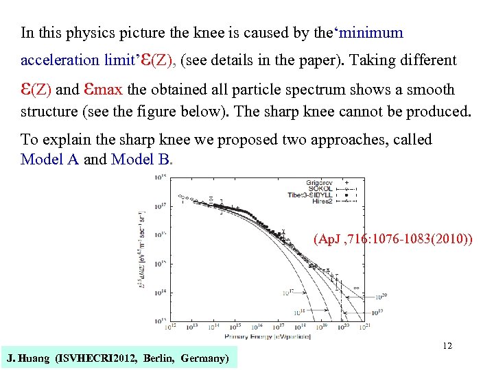 In this physics picture the knee is caused by the‘minimum acceleration limit’ε(Z), (see details in the paper). Taking different ε(Z) and εmax the obtained all particle spectrum shows a smooth structure (see the figure below). The sharp knee cannot be produced. To explain the sharp knee we proposed two approaches, called Model A and Model B. (Ap. J , 716: 1076 -1083(2010)) J. Huang (ISVHECRI 2012, Berlin, Germany) 12