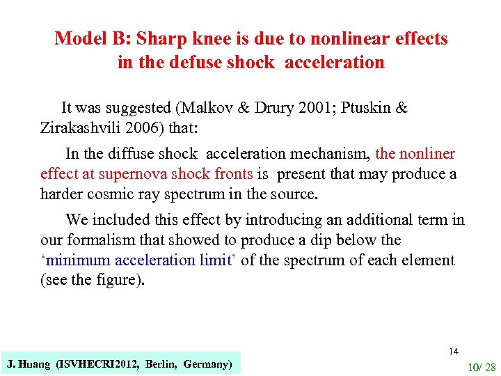 Model B: Sharp knee is due to nonlinear effects in the defuse shock acceleration It was suggested (Malkov & Drury 2001; Ptuskin & Zirakashvili 2006) that: In the diffuse shock acceleration mechanism, the nonliner effect at supernova shock fronts is present that may produce a harder cosmic ray spectrum in the source. We included this effect by introducing an additional term in our formalism that showed to produce a dip below the ‘minimum acceleration limit’ of the spectrum of each element (see the figure). J. Huang (ISVHECRI 2012, Berlin, Germany) 14 10/ 28