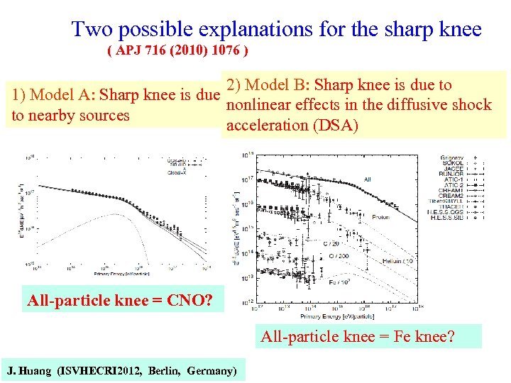 Two possible explanations for the sharp knee ( APJ 716 (2010) 1076 ) 2) Model B: Sharp knee is due to 1) Model A: Sharp knee is due nonlinear effects in the diffusive shock to nearby sources acceleration (DSA) All-particle knee = CNO? All-particle knee = Fe knee? J. Huang (ISVHECRI 2012, Berlin, Germany)