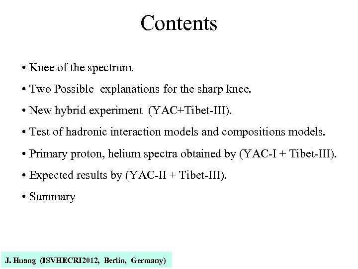 Contents • Knee of the spectrum. • Two Possible explanations for the sharp knee. • New hybrid experiment (YAC+Tibet-III). • Test of hadronic interaction models and compositions models. • Primary proton, helium spectra obtained by (YAC-I + Tibet-III). • Expected results by (YAC-II + Tibet-III). • Summary J. Huang (ISVHECRI 2012, Berlin, Germany)