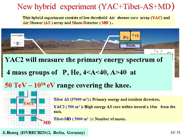 In order to distinguish between Model A and Model B and many other models, measurements of the chemical composition around the knee, especially measurements of the spectra of individual component till their knee will be essentially important. Therefore, we planed a new experiment: These aims will be realized by our new experiments 1) to lower down the energy measurement of individual YAC (Yangbajing AS Core array) ! component spectra to *10 Te. V and make connection with direct measurements; 2) to make a high precision measurement of primary p, He, …, Fe till 100 Pe. V region to see the rigidity cutoff effect. J. Huang (ISVHECRI 2012, Berlin, Germany) 15/ 31