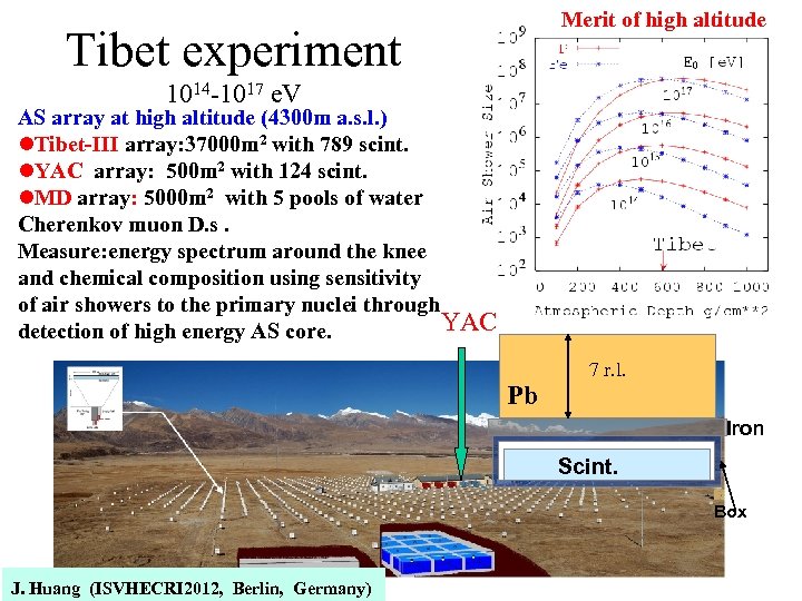 Merit of high altitude Tibet experiment 1014 -1017 e. V AS array at high altitude (4300 m a. s. l. ) l. Tibet-III array: 37000 m 2 with 789 scint. l. YAC array: 500 m 2 with 124 scint. l. MD array: 5000 m 2 with 5 pools of water Cherenkov muon D. s. Measure: energy spectrum around the knee and chemical composition using sensitivity of air showers to the primary nuclei through YAC detection of high energy AS core. Pb 7 r. l. Iron Scint. Box J. Huang (ISVHECRI 2012, Berlin, Germany)