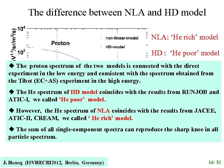 The difference between NLA and HD model NLA: ‘He rich’ model HD : ‘He poor’ model u The proton spectrum of the two models is connected with the direct experiment in the low energy and consistent with the spectrum obtained from the Tibet (EC+AS) experiment in the high energy. u The He spectrum of HD model coincides with the results from RUNJOB and ATIC-I, we called ‘He poor’ model. u However, the He spectrum of NLA coincides with the results from JACEE, ATIC-II, CREAM, we called ‘ He rich’ model. u The sum of all single-component spectra can reproduce the sharp knee in all particle spectrum. J. Huang (ISVHECRI 2012, Berlin, Germany) 16/ 31
