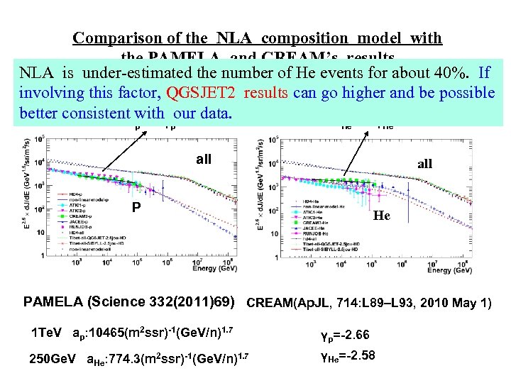 Comparison of the NLA composition model with the PAMELA and CREAM’s results NLA is under-estimated the number of He events for about 40%. If Black line: Proton , He spectrum from PAMELA and CREAM experiment involving this factor, QGSJET 2 results can go higher and be possible better consistent with our data. Y=a *E**γ p p He He all P He PAMELA (Science 332(2011)69) CREAM(Ap. JL, 714: L 89–L 93, 2010 May 1) 1 Te. V ap: 10465(m 2 ssr)-1(Ge. V/n)1. 7 γp=-2. 66 250 Ge. V a. He: 774. 3(m 2 ssr)-1(Ge. V/n)1. 7 γHe=-2. 58
