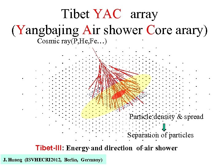 Tibet YAC array (Yangbajing Air shower Core arary) Cosmic ray(P, He, Fe…) Particle density & spread Separation of particles Tibet-III: Energy and direction of air shower J. Huang (ISVHECRI 2012, Berlin, Germany)