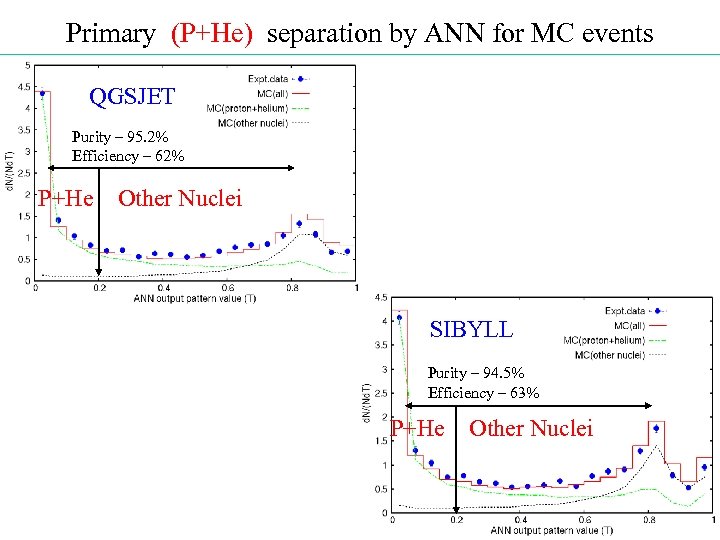 Primary (P+He) separation by ANN for MC events QGSJET Purity – 95. 2% Efficiency – 62% P+He Other Nuclei SIBYLL Purity – 94. 5% Efficiency – 63% P+He Other Nuclei