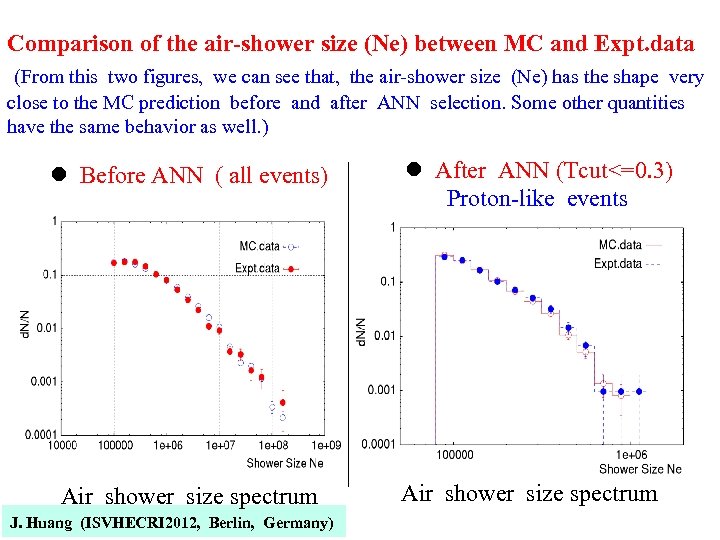 Comparison of the air-shower size (Ne) between MC and Expt. data (From this two figures, we can see that, the air-shower size (Ne) has the shape very close to the MC prediction before and after ANN selection. Some other quantities have the same behavior as well. ) l Before ANN ( all events) Air shower size spectrum J. Huang (ISVHECRI 2012, Berlin, Germany) l After ANN (Tcut<=0. 3) Proton-like events Air shower size spectrum