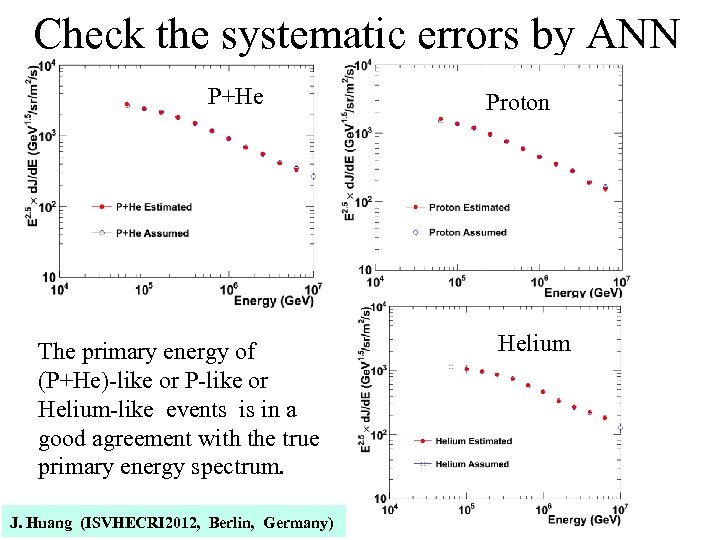 Check the systematic errors by ANN P+He The primary energy of (P+He)-like or P-like or Helium-like events is in a good agreement with the true primary energy spectrum. J. Huang (ISVHECRI 2012, Berlin, Germany) Proton Helium