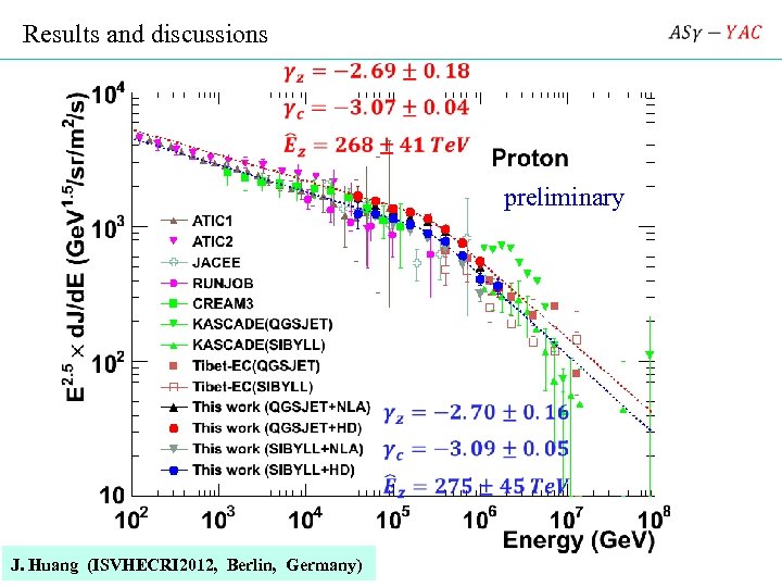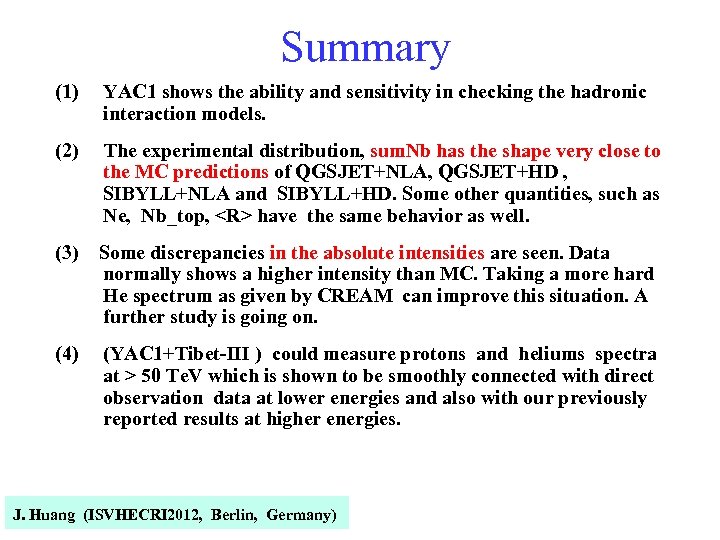 (5) We obtained the primary energy spectrum of proton, helium and (P+He) spectra between 50 Te. V and 1 Pe. V , and found that the knee of the (P+He) spectra is located around 400 Te. V. (6) The interaction model dependence in deriving the primary proton, helium and (P+He) spectra are found to be small (less than 25% in absolute intensity, 10% in position of the knee ), and the composition model dependence is less than 10% in absolute intensity, and various systematic errors are under study now ! (7) Next phase experiment YAC 2 will measure the primary energy spectrum of 4 mass groups of P, He, 440 at 1014 – 1016 e. V range covering the knee. J. Huang (ISVHECRI 2012, Berlin, Germany)