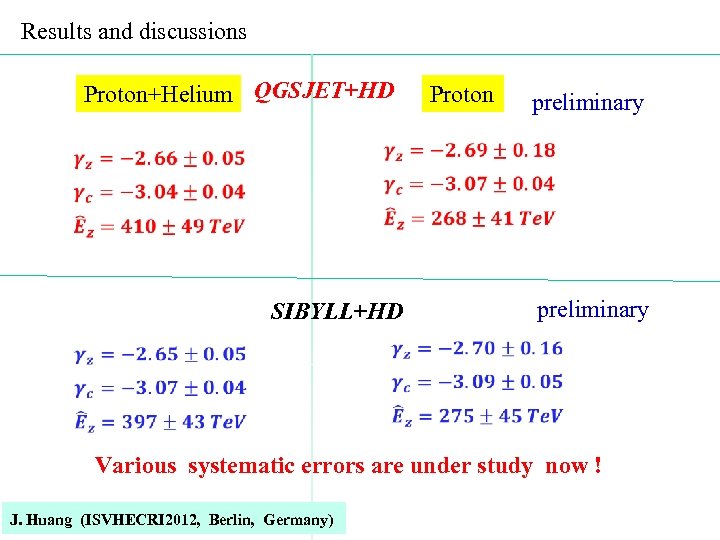 Results and discussions Proton+Helium QGSJET+HD Proton preliminary SIBYLL+HD preliminary Various systematic errors are under study now ! J. Huang (ISVHECRI 2012, Berlin, Germany)