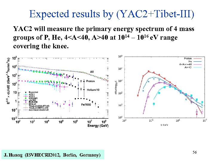 Expected results by (YAC 2+Tibet-III) YAC 2 will measure the primary energy spectrum of 4 mass l Solid lines: input 14 – 1016 e. V range groups of P, He, 440 at 10 l Symbols: reconstructed l Expected primary energy spectra covering the knee. J. Huang (ISVHECRI 2012, Berlin, Germany) 56