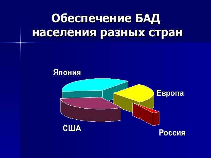 Отношение к БАД в различных странах • • • В Японии БАД применяют более 50 лет, в США – 20 лет. БАД достаточно широко используют во многих странах: во Франции и Германии около 60% населения ежедневно принимают БАД, в США – 80%, Японии – 90%, в России – только 3%. В Австрии, например, БАД считают отдельной категорией продуктов, рассматривают как нечто среднее между пищевыми продуктами и лекарственными средствами. В Бельгии, Нидерландах и Греции под БАД понимают только витамины и минеральные вещества, относят к продуктам питания, которые подлежат строгому контролю в отношении разовых и суточных доз. В Германии продукт, предназначенный к приему внутрь, может быть или только лекарством, или продуктом питания. В этой стране положение об аптеке предусматривает, что в ней вместе с лекарственными средствами могут продаваться продукты, являющиеся дополнениями к питанию. В рекламе БАД на территории Германии допустимы такие сочетания слов, как "дополняет питание", "для здорового питания", "для покрытия суточной потребности", "полезно для здоровья" и т. п. На упаковке БАД и в рекламе о них недопустимы рекомендации типа: "защищает от . . . ", "уменьшает содержание холестерина в крови", "предназначается для нормализации кровяного давления" и т. п.