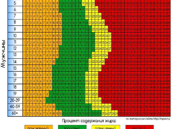 сколько жировой ткани допустимо иметь здоровому человеку? Для каждого человека оптимальная величина жировой ткани различна. И зависит она от многих факторов, например от конституции тела, возраста, наследственности и образа жизни человека. Удобнее всего жировую ткань измерять не в килограммах, а в процентах от массы тела. Потому как, для здорового 45 -летнего мужчины весом в 100 кг. иметь 20 килограммов жира это совершенно нормально, но для юной девушки, весом 60 кг. иметь столько жировой ткани просто опасно для здоровья. В первом случае процент жировой ткани составляет 20%, а во втором соответственно — 33, 3%.