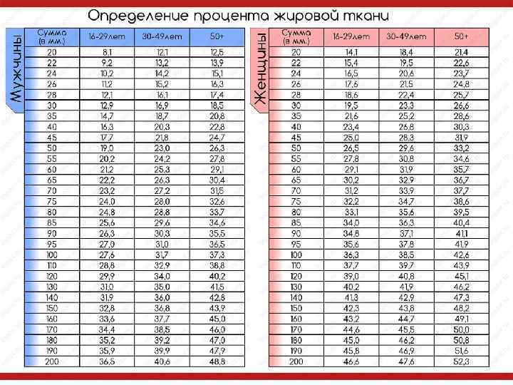% содержание жировой ткани в теле мужчины Физически подготовленные лица спортсмены Жизненно необходимый жир женщины 12 -18 16 -25 5 -13 12 -22 3 -5 11 -14
