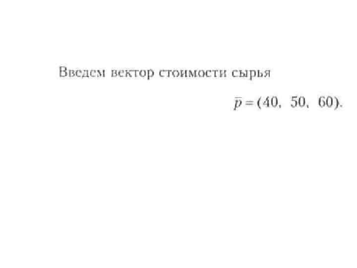 • Решение. По данным табл. составим четыре вектора, характеризующие весь производственный цикл: • • q = (20, 50, 30, 40) — вектор ассортимента; • • s = (5, 2, 7, 4) —вектор расхода сырья; • • t = (10, 5, 15, 8) — вектор затрат рабочего времени; • • р = (30, 15, 45, 20)— вектор стоимости. • Тогда искомые величины будут представлять собой соответствующие скалярные произведения вектора ассортимента q на три других вектора, т. е. • S=qs=100+100 + 210+160 = 570 кг, T = qt=1220 ч, • P = qp = 3500 ден. ед.