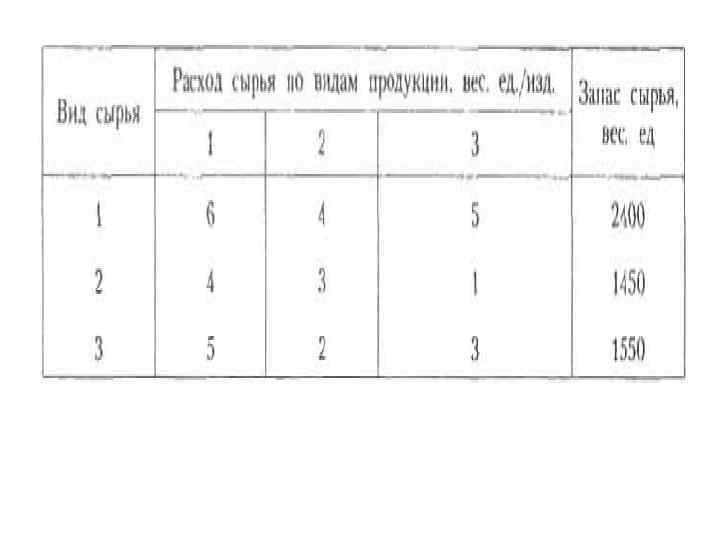 Предприятие выпускает три вида продукции, используя сырье трех типов. Необходимые характеристики производства указаны в табл. 3. Требуется определить объем выпуска продукции каждого вида при заданных запасах сырья. Задачи такого рода типичны при прогнозах и оценках функционирования предприятий, экспертных оценках проектов освоения месторождений полезных ископаемых, а также в планировании микроэкономики предприятий.