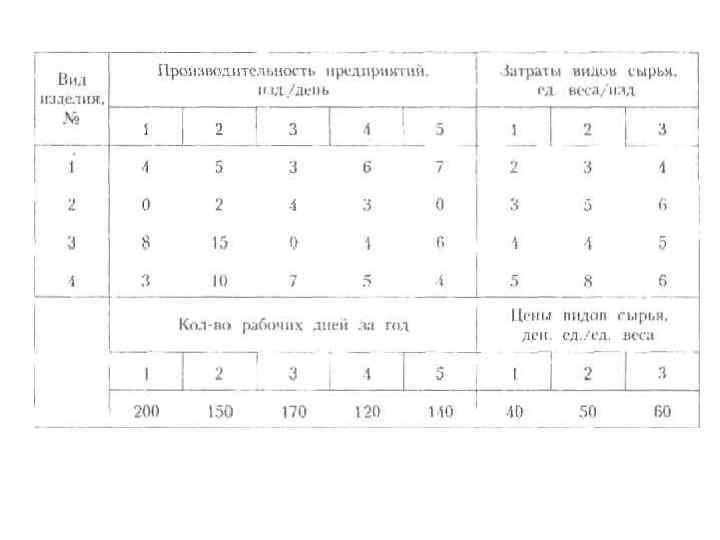 Требуется определить следующие ежесуточные показатели: расход сырья S, затраты рабочего времени Г и стоимость Р выпускаемой продукции предприятия,