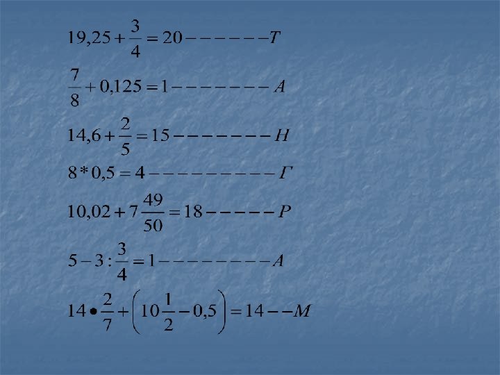 Совместные действия с обыкновенными и десятичными дробями. 1)- 2, 5 + 2 = Н 2)- 3, 2 - 4, 5 = М 3)- 4, 5 * (- 2) = Ш 4) - = Ь 5) * = К 6)4 : = А 7) : = Н 8)- 4, 7 : 0 = И 9)0 : (-101) = А 10) = М 11)- 0, 125 * 0 = Е 12) - 0, 125 = С 13) + 0, 25 = К 14) * = Й 15) - 4, 5 = А