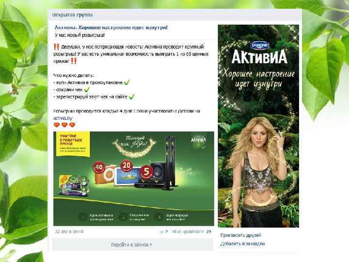 Основные средства PR Социальные сети «Активиа» (Вконтакте, Одноклассники, Facebook) также обновили свой внешний вид и наполнение. Здесь можно найти еще больше интересной информации о хорошем настроении, танцах, а также поучаствовать в конкурсах и выиграть призы.
