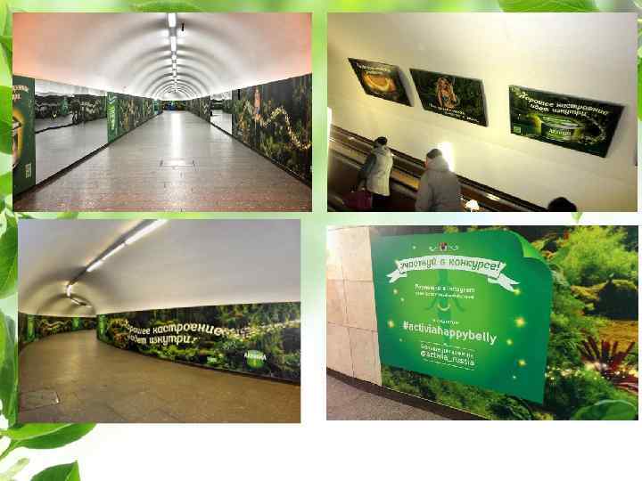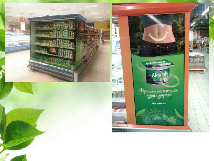 Брендинг в местах продаж Полки с «Активиа» на время кампании стали ярко-зелеными с помощью новых рекламных материалов. Топперы, стопперы, брендленты, брендированные торцы молочнодесертной категории, холодильники, постеры и подвесные баблы привлекают внимание потребителей и доносят главный слоган кампании «Хорошее настроение идет изнутри» .