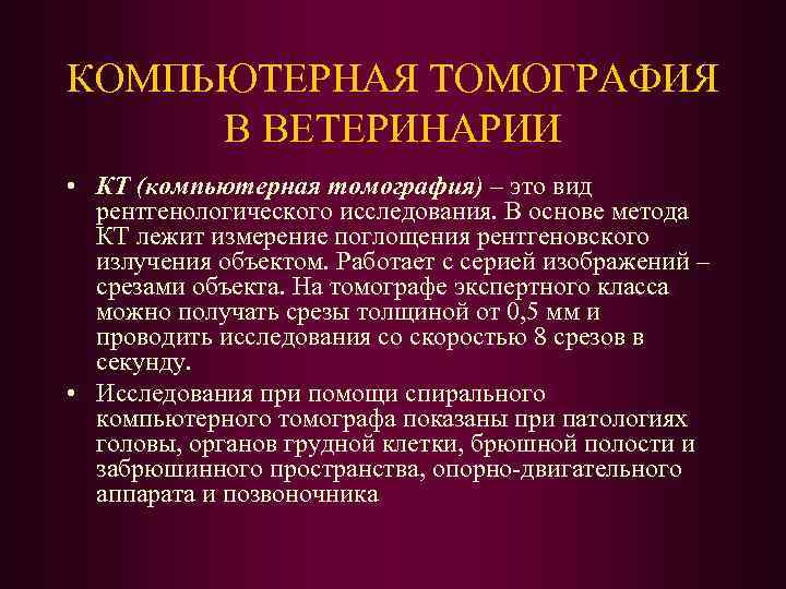 КОМПЬЮТЕРНАЯ ТОМОГРАФИЯ В ВЕТЕРИНАРИИ • КТ (компьютерная томография) – это вид рентгенологического исследования. В основе метода КТ лежит измерение поглощения рентгеновского излучения объектом. Работает с серией изображений – срезами объекта. На томографе экспертного класса можно получать срезы толщиной от 0, 5 мм и проводить исследования со скоростью 8 срезов в секунду. • Исследования при помощи спирального компьютерного томографа показаны при патологиях головы, органов грудной клетки, брюшной полости и забрюшинного пространства, опорно-двигательного аппарата и позвоночника
