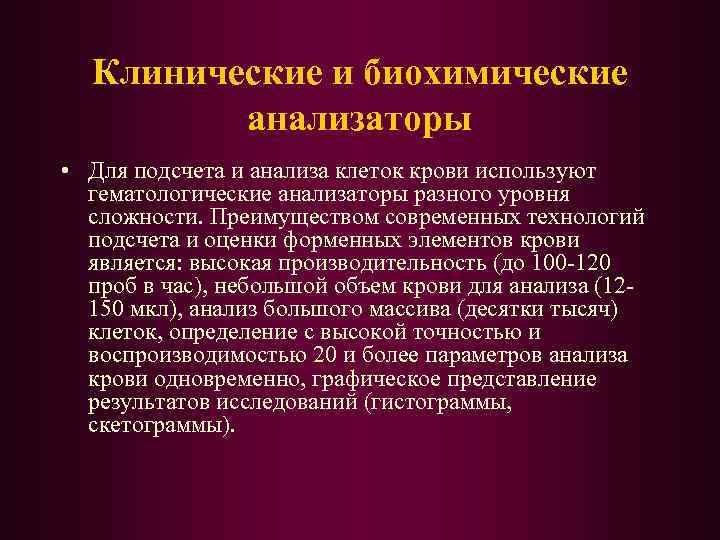 Клинические и биохимические анализаторы • Для подсчета и анализа клеток крови используют гематологические анализаторы разного уровня сложности. Преимуществом современных технологий подсчета и оценки форменных элементов крови является: высокая производительность (до 100 -120 проб в час), небольшой объем крови для анализа (12150 мкл), анализ большого массива (десятки тысяч) клеток, определение с высокой точностью и воспроизводимостью 20 и более параметров анализа крови одновременно, графическое представление результатов исследований (гистограммы, скетограммы).