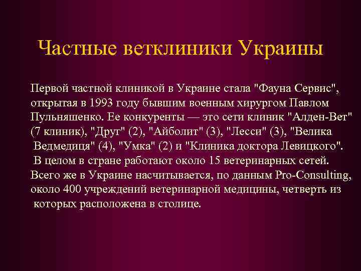 Частные ветклиники Украины Первой частной клиникой в Украине стала "Фауна Сервис", открытая в 1993 году бывшим военным хирургом Павлом Пульняшенко. Ее конкуренты — это сети клиник "Алден-Вет" (7 клиник), "Друг" (2), "Айболит" (3), "Лесси" (3), "Велика Ведмедиця" (4), "Умка" (2) и "Клиника доктора Левицкого". В целом в стране работают около 15 ветеринарных сетей. Всего же в Украине насчитывается, по данным Pro-Consulting, около 400 учреждений ветеринарной медицины, четверть из которых расположена в столице.