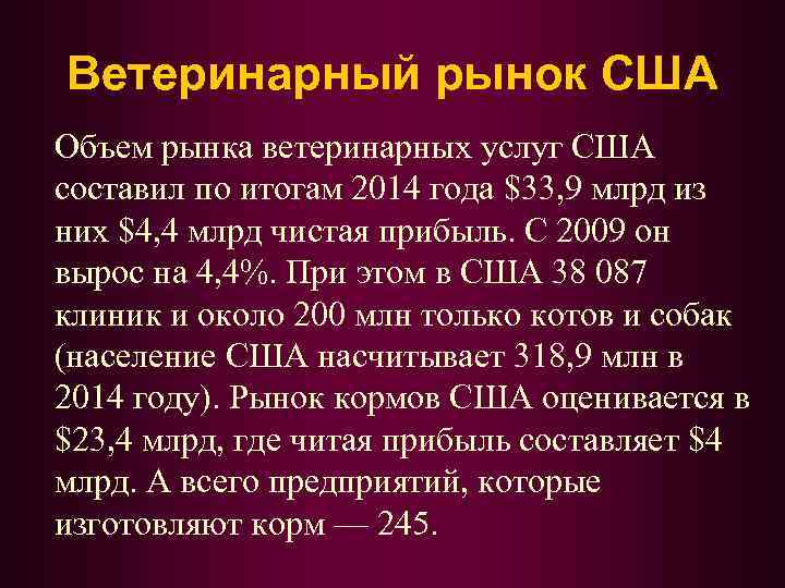 Ветеринарный рынок США Объем рынка ветеринарных услуг США составил по итогам 2014 года $33, 9 млрд из них $4, 4 млрд чистая прибыль. С 2009 он вырос на 4, 4%. При этом в США 38 087 клиник и около 200 млн только котов и собак (население США насчитывает 318, 9 млн в 2014 году). Рынок кормов США оценивается в $23, 4 млрд, где читая прибыль составляет $4 млрд. А всего предприятий, которые изготовляют корм — 245.