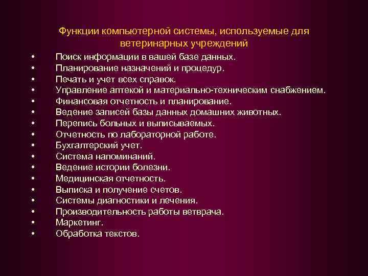 Функции компьютерной системы, используемые для ветеринарных учреждений • • • • • Поиск информации в вашей базе данных. Планирование назначений и процедур. Печать и учет всех справок. Управление аптекой и материально-техническим снабжением. Финансовая отчетность и планирование. Ведение записей базы данных домашних животных. Перепись больных и выписываемых. Отчетность по лабораторной работе. Бухгалтерский учет. Система напоминаний. Ведение истории болезни. Медицинская отчетность. Выписка и получение счетов. Системы диагностики и лечения. Производительность работы ветврача. Маркетинг. Обработка текстов.